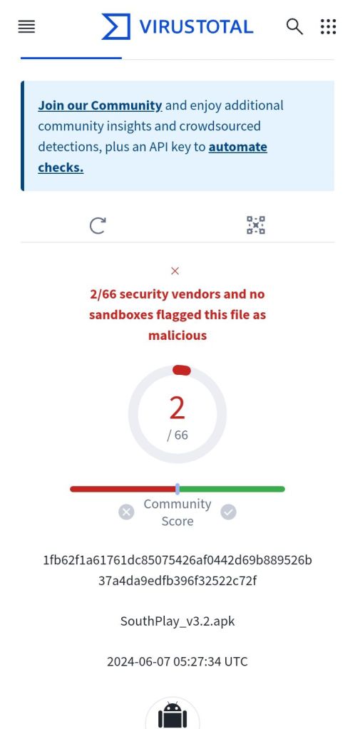 Después de realizar un análisis exhaustivo de nuestra aplicación, nos gustaría abordar el número 2/66 en rojo que aparece en la imagen de Total Virus. Este número indica que dos de los 66 antivirus analizados han detectado un posible problema con nuestra aplicación. Queremos asegurarles que hemos investigado minuciosamente esta detección y no hemos encontrado ningún elemento malicioso en nuestra aplicación.